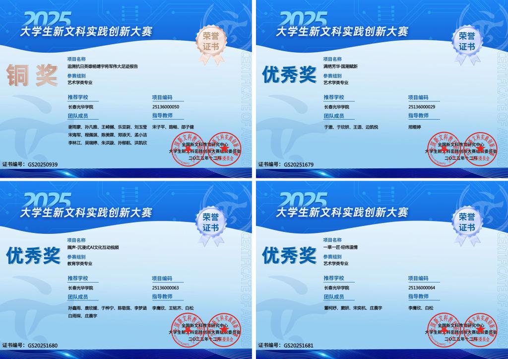 其中,由创新创业学院宋子平、路畅与电影学院邵子健三位教师联合指导的《追溯抗日英雄杨靖宇将军伟大足迹报告》项目,聚焦吉林省红色抗联历史传承,以吉林省红色历史文化发展为主线,创新融合多学科知识与数字技术,构建起“调研-设计-实践-转化”的完整创新链条,凭借新颖的方案设计与显著的应用价值荣获国家级铜奖;《满绣芳华·国潮赋新》《隅声-沉浸式AI文化互动视频》《一草一匠·经纬温情》《法彩丝韵,石语跨境》《吉林省红色文化“游”记:红色文化和旅游融合发展实施路径研究》《谷星创域——AI技术下的文化创新传承》《历史人物文化资源视域下吴大澂文创产品创新设计研究》7个项目,亦因各具特色的创新思路与扎实的实践成效,斩获国家级优秀奖。