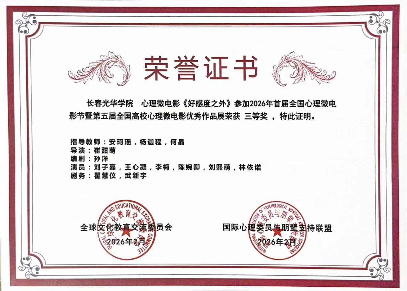 在全球文化教育交流委员会、国际心理委员与朋辈支持联盟联合主办的2026年首届全国心理微电影节暨第五届全国高校心理微电影优秀作品展示活动中,学校选送的作品荣获三等奖。