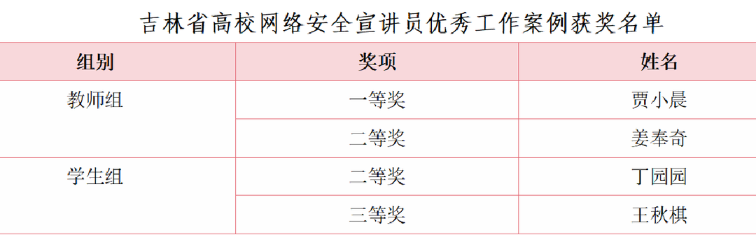 为深入宣传贯彻落实习近平总书记关于网络强国的重要思想,贯彻落实习近平总书记对网络安全工作“四个坚持”的重要指示,在第十个全国网络安全宣传周校园日到来之际,省教育厅开展了全省高校网络安全宣讲员优秀工作案例评选表彰工作。经学校推荐、教育厅相关职能处室遴选确定,我校共有4名师生获奖,其中一等奖1项,二等奖2项,三等奖1项。