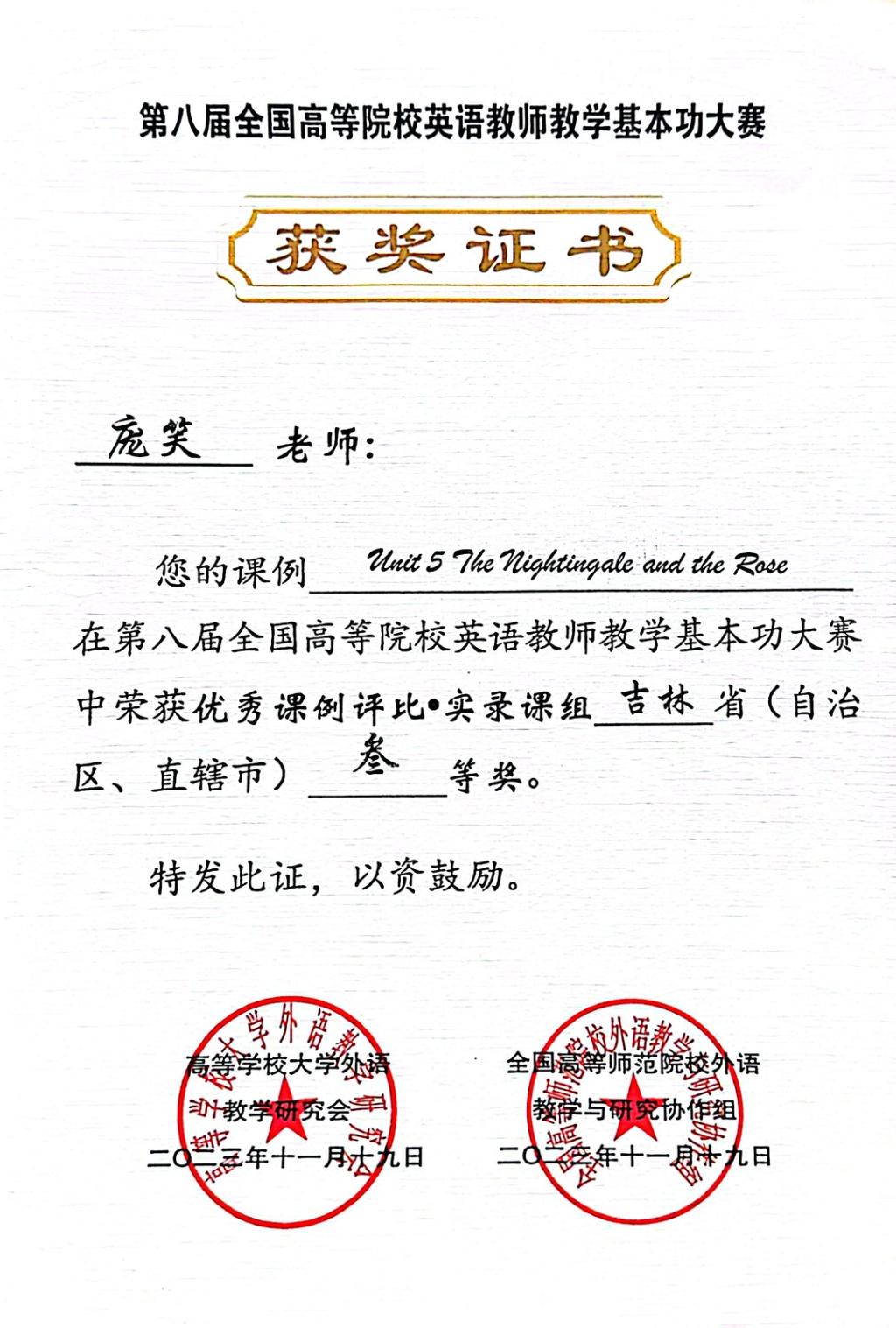为全面贯彻落实党的二十大精神,加强高校基础学科人才培养,全面深化“四新”建设,着力打造高校外语教学金课建设,促进优质课程资源广泛共享,第八届全国高等院校英语教师教学基本功大赛于3月15日正式启动。经过专家委员会严格评审,我校外国语学院英语专业杨迪老师同参赛团队(杨迪、毕晨慧、程雪)荣获微课组全国一等奖,英语专业程雪老师荣获说课组省级二等奖,英语专业庞笑老师荣获实录课组省级三等奖。