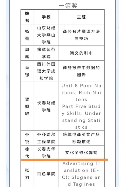 这一奖项不仅是对徐代老师个人专业素养与辛勤付出的肯定,也彰显了我校商务英语系在师资队伍建设、教学改革与实践方面的显著成效。此次获奖将进一步激励我校广大教师不断探索新时代商务英语教育教学的新路径,努力提升教学质量与人才培养水平,为我国商务英语翻译事业输送更多高素质的专业人才。同时,我校也将以此为契机,继续深化与国内同行的合作交流,共同推动我国商务英语教育事业的发展与繁荣。(供稿:外国语学院 审核:贾小晨 赵健 编辑:刘安妮)