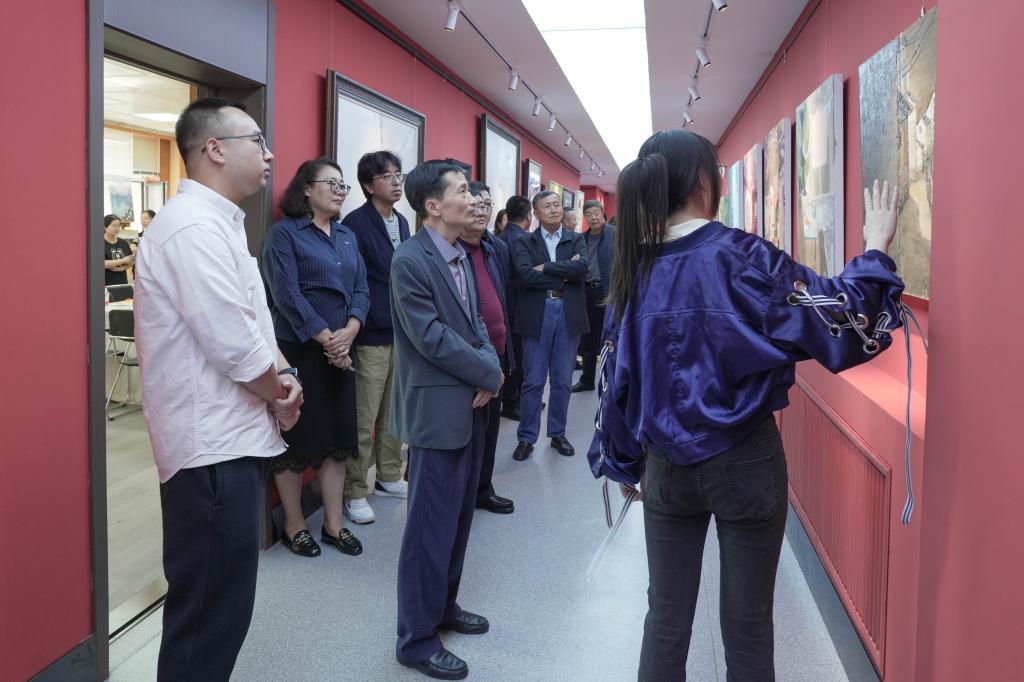 参观中,全体人员先行来到美术创研工作室展示长廊,集中参观工作室师生油画作品,师生们详细介绍了作品的创作背景及感悟。