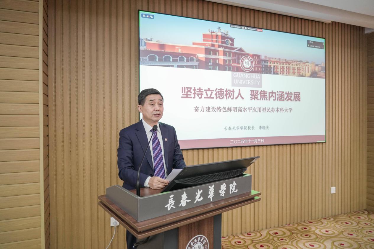 长春光华学院校长李晓光以《坚持立德树人聚焦内涵发展奋力建设特色鲜明高水平应用型民办本科大学》为题作工作汇报。他系统回顾了学校25年来的办学历程,重点介绍了在“素质培根、思想铸魂、专业启智、文化润心”育人理念引领下,学校在养成教育、课程思政、产教融合、文化育人等方面取得的显著成效。深入分析了学校当前存在的主要问题,明确了未来改进方向。同时,对自评报告数据作了补充说明。他表示,本次审核评估是学校总结过去、审视当下、规划未来的宝贵契机。学校将以高度的责任感和使命感,全力配合好专家组的考察评估工作。对自评发现和专家指出的问题,将深刻剖析根源,认真制定整改方案,以评促建、以评促改、以评促管、以评促强。