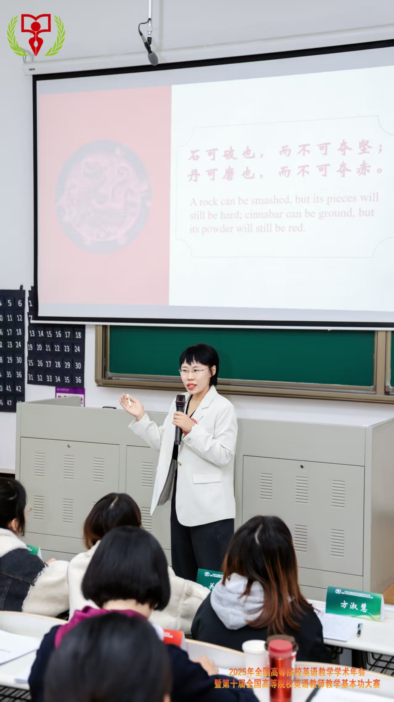 现场授课对象为南京理工大学外国语学院学生。该课程以《理解当代中国》中国“新长征”为核心主题,教学中徐代老师通过石可破也,而不可夺坚;丹可磨也,而不可夺赤的中英文解读,先阐明“事物核心属性不因外在挑战而改变”的内涵,进而自然引出“新长征”需坚守“为民族复兴奋斗”的坚定信念,清晰搭建起古语精神与新长征信念的关联,为“外语教学+思政”融合提供了实践样本。