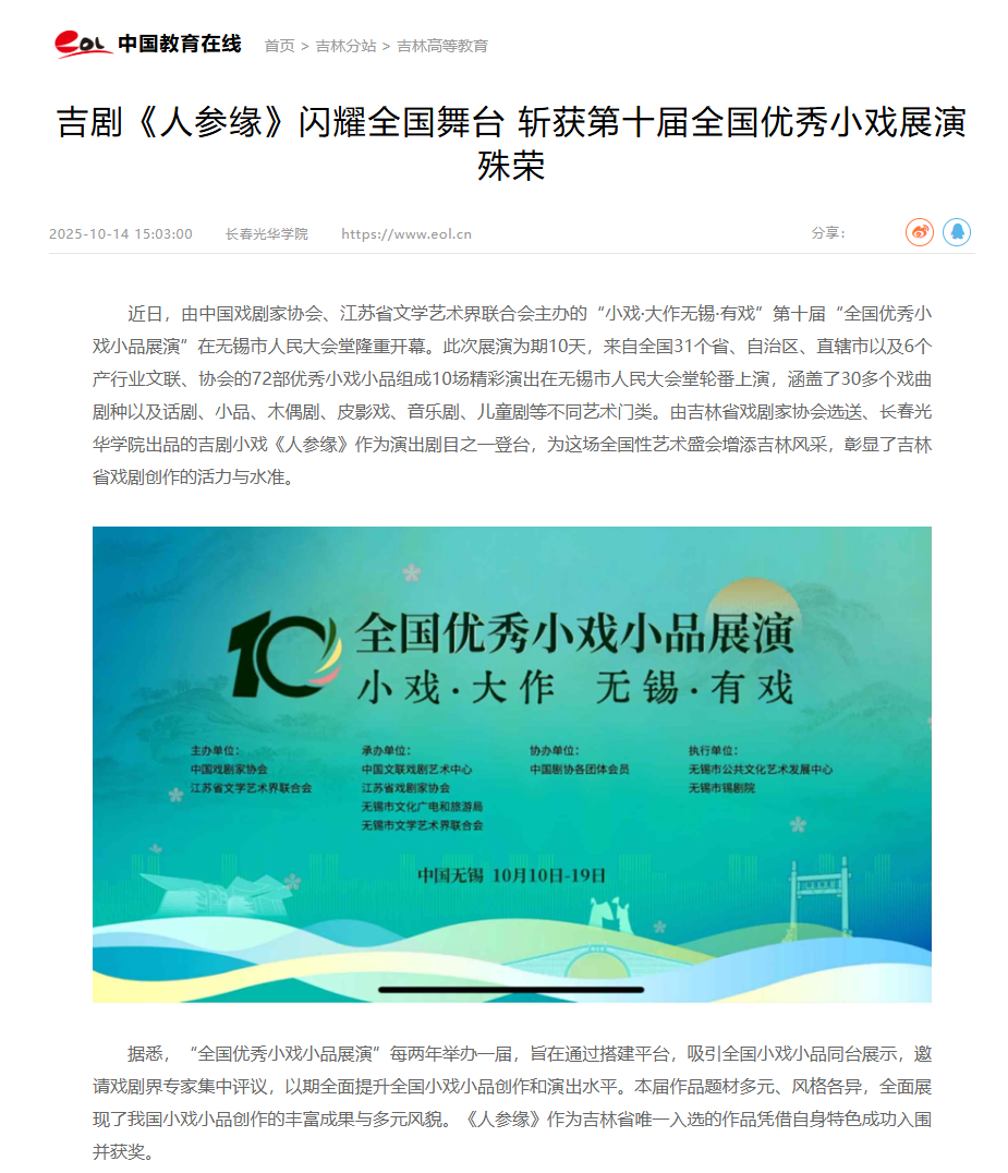 中国教育在线|吉剧《人参缘》闪耀全国舞台 斩获第十届全国优秀小戏展演殊荣